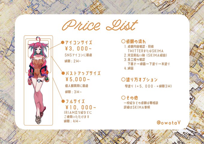 1 3 イラスト有償依頼の料金表作りました😎✨ 少しでも気になった方はDMにてご相談下さい! #有償依頼 #イラスト SKIMA→skima.jp/item/detail?it… 21/09/25 22:44