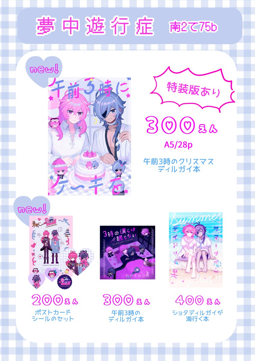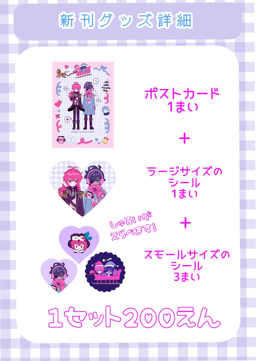 【おしらせ】 12月28日開催、神の叡智6のおしながきです。 新刊はクリスマスディルガイ本→pixiv.net/artworks/10358… と、ポストカードとシールのセットがあります。 南2て75bでお待ちしております。当日は宜しくお願い致します。