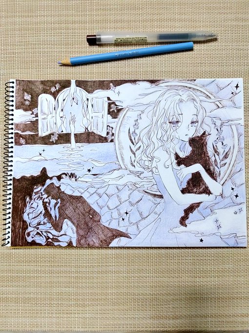 懐かしい記憶🌼🐈⬛ ボールペンと色鉛筆でらくがきしました💫 #イラスト #らくがき #ボールペン画 #色鉛筆 #illustration #絵描きさんと繋がりたい