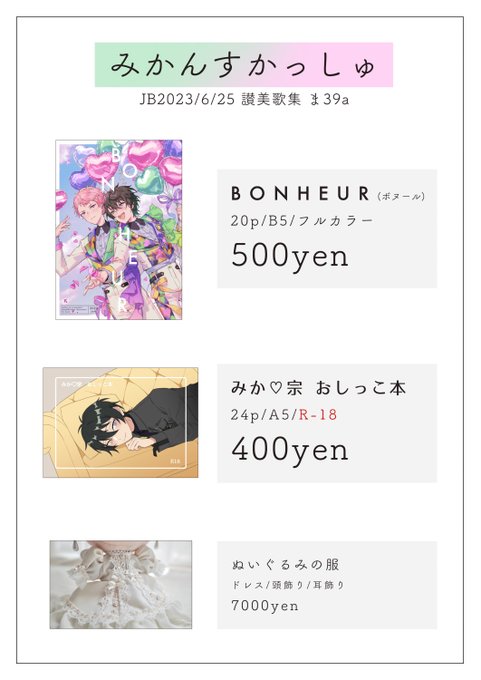 23 79 JB2023/6/25お品書きです イラスト本と漫画(@niceimo)があります📕 ぬいぐるみ服の写真は↓ツイートにて 23/06/21 00:19