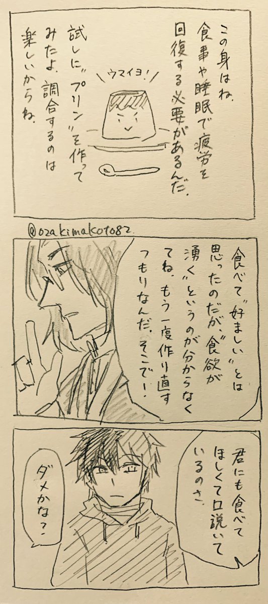 4 19 #南肥深夜のワンドロワンライ60分1本勝負 「プリン」 前描いたやつの設定で、出会って数日くらいのつもりです。 22/07/15 10:21