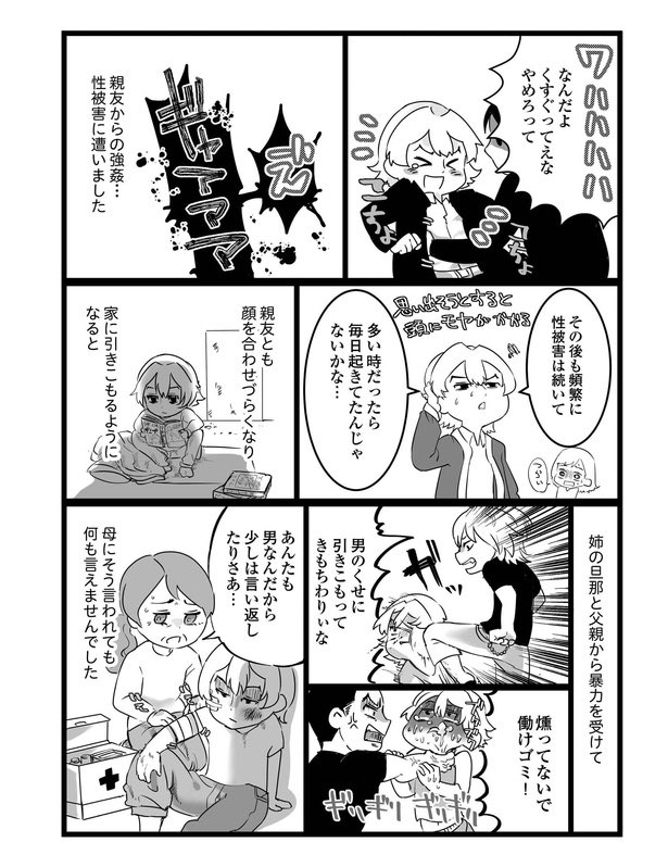 27 42 辛い体験も"なかったこと"にされる「男なんだから我慢しろ」の呪縛の話。(1/4) ※虐待と性被害の描写があります #漫画が読めるハッシュタグ 23/07/27 19:18