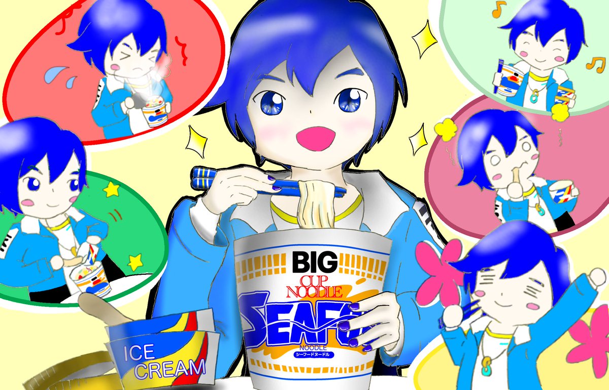 カップヌードルのイラストコンテストのやつです✨ アイスと一緒にラーメンを食べる兄さん‼︎🍜🍨 ラーメンを口にするまでの様子も見てみてください〜 #KAITO #KAITO誕生祭2022 #KAITOお誕生会2022 #プロセカ #カップヌードルのセカイ #デジタルイラスト #アイビスペイント