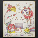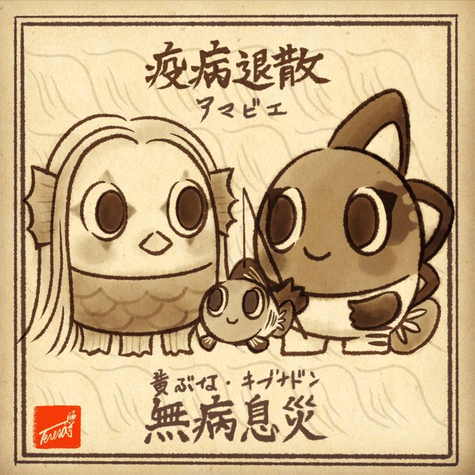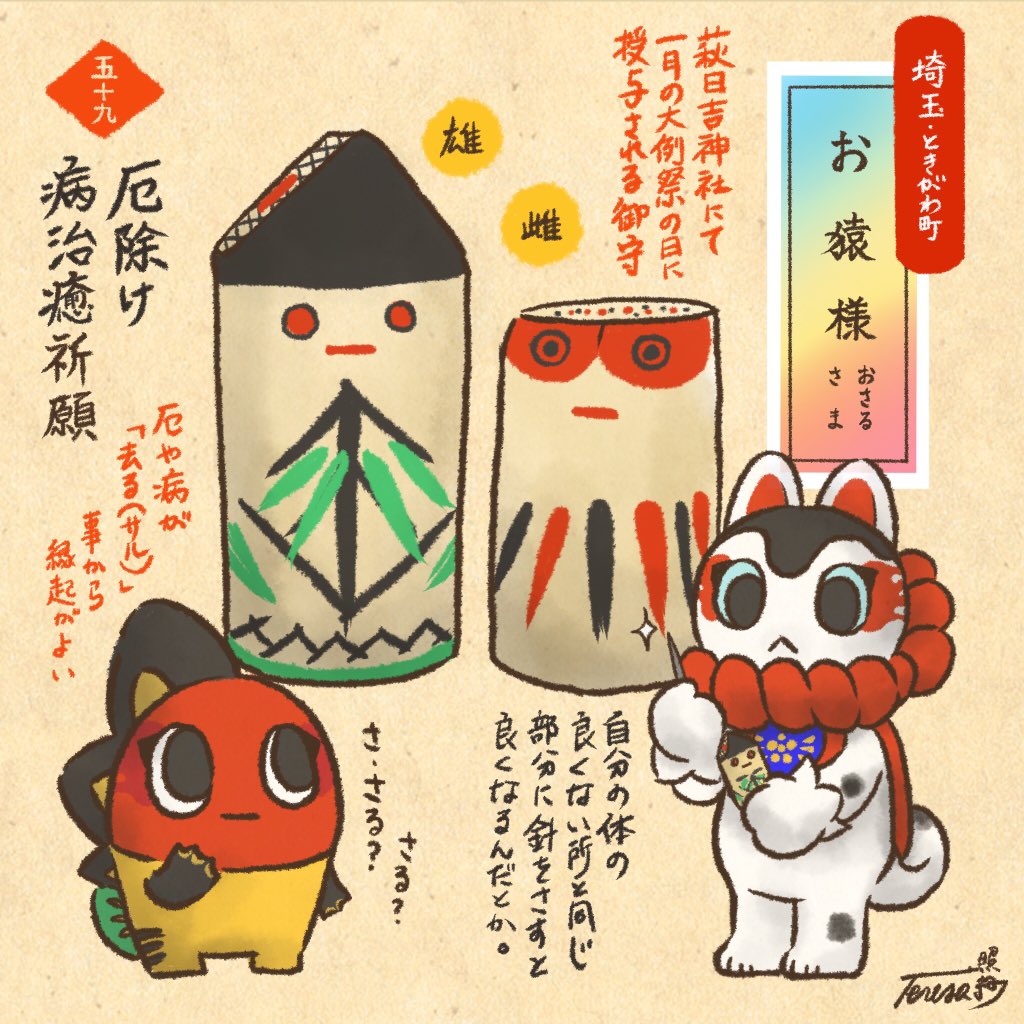 [59:お猿様(埼玉の郷土玩具)] 烏帽子を被った雄と目の周りが赤い雌のつがいの猿の人形は、萩日吉神社にて1月の大例祭の日だけに授与される厄除け・病治癒祈願のお守り。厄や病が「去る(猿)」とかけています。「猿に見えないと有名」らしい独特な可愛さがじわじわ来ますよ…🐵✨ #お絵描きお百度参り