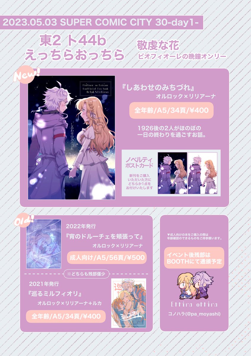 31 58 5/3スパコミのお品書きです◎ 【東2 ト44b】にてお待ちしております!よろしくお願いいたします🌼 オルリリ新刊サンプルはこちら→ pixiv.net/artworks/10730… 23/04/18 22:07