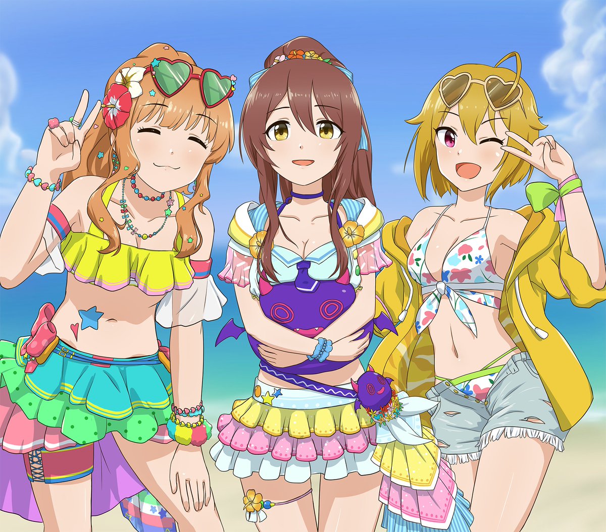 ポプマスのガチャに推し三人の水着が来て死んだので描いた