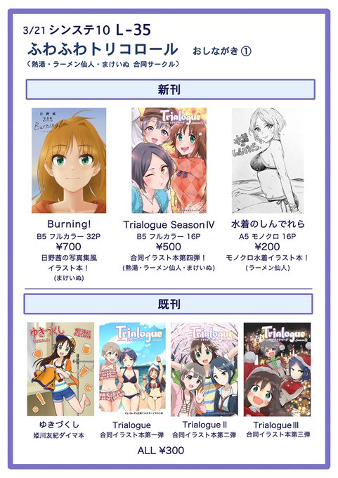 3/21シンステ10の新刊①です! 熱湯(@nettou3) ラーメン仙人(@larmen141) まけいぬ(@pakrom) の三人による合同イラスト本の第四弾! これで春夏秋冬表紙が揃ったぞ!