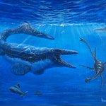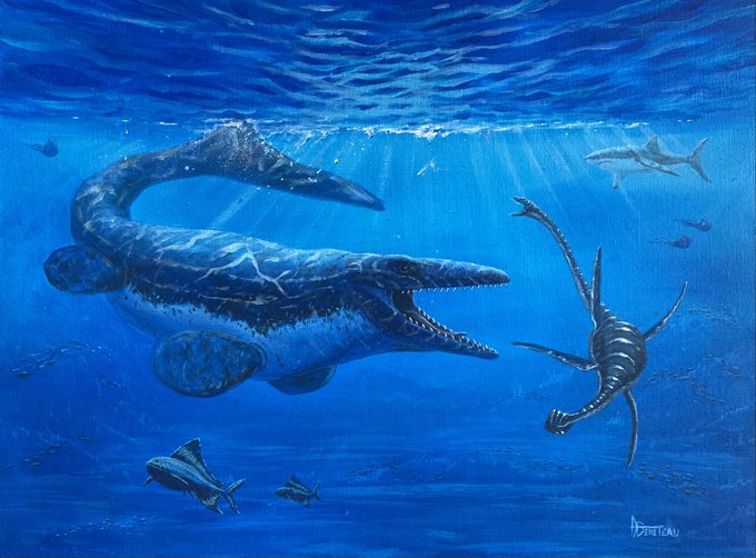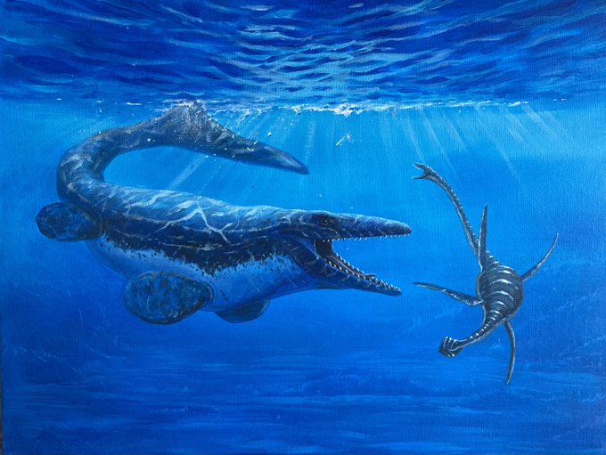 Elasmosaurus and Ichthyornis – Acrylic painting – 80/60 cm. #paleoart #paleoartist #marinereptile #commission #birdeyeview #cretaceous #mesozoic #dinosaur #traditionalart #original #animalart