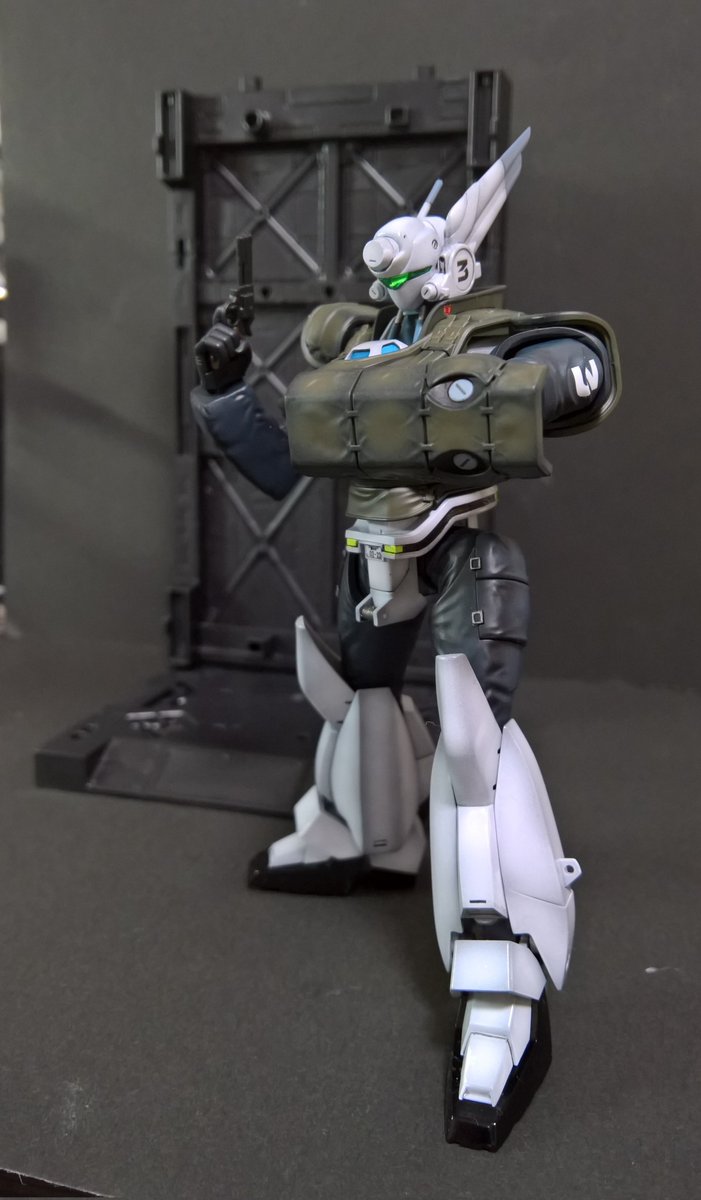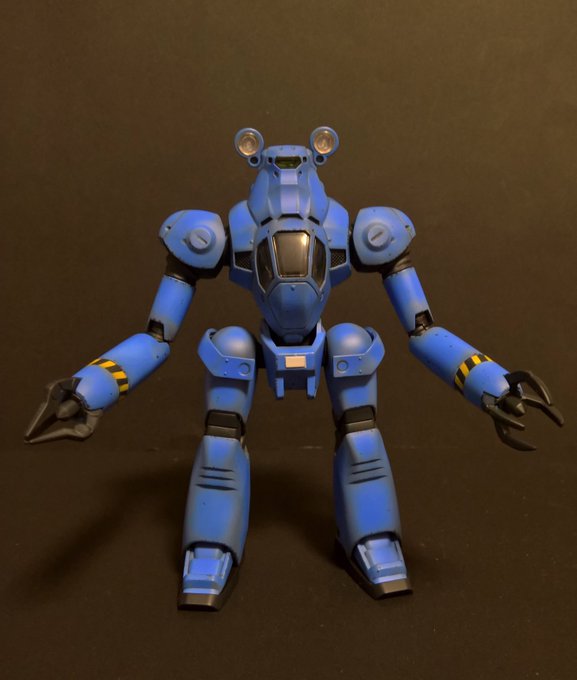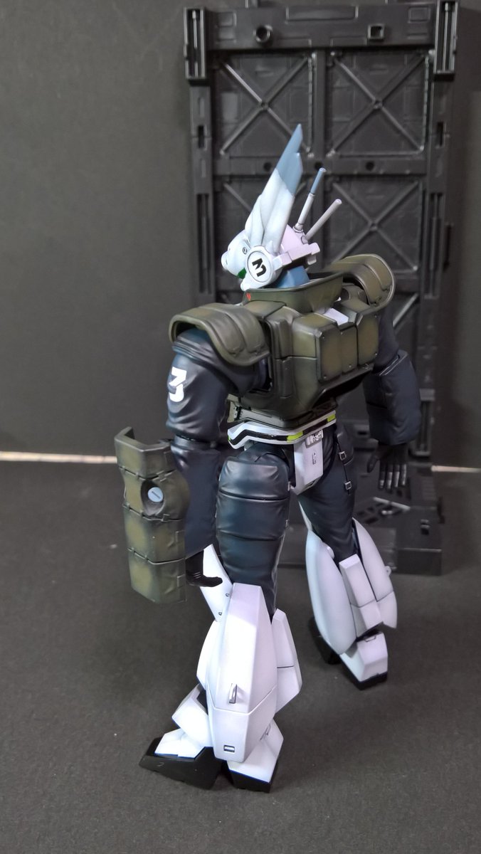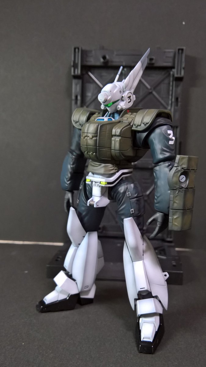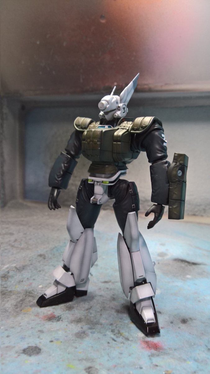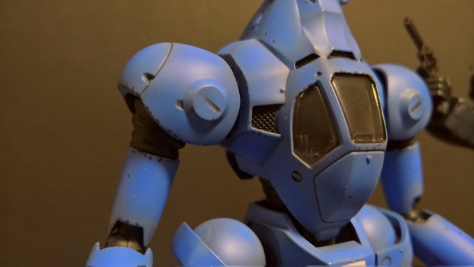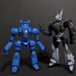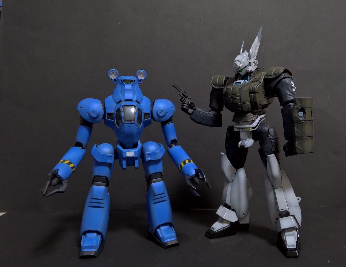 前ページの続き、青を発色させようと白立ち上げ。汚しは控え気味。塗装剥げの表現くらいにしておきました。腕のトラマーキングはシールをマスキングにて塗りました。3号機との対比🤔イングラムと比較 後までお付き合いいただきありがとうございました。 #パトレイバー模型部 # MODEROID