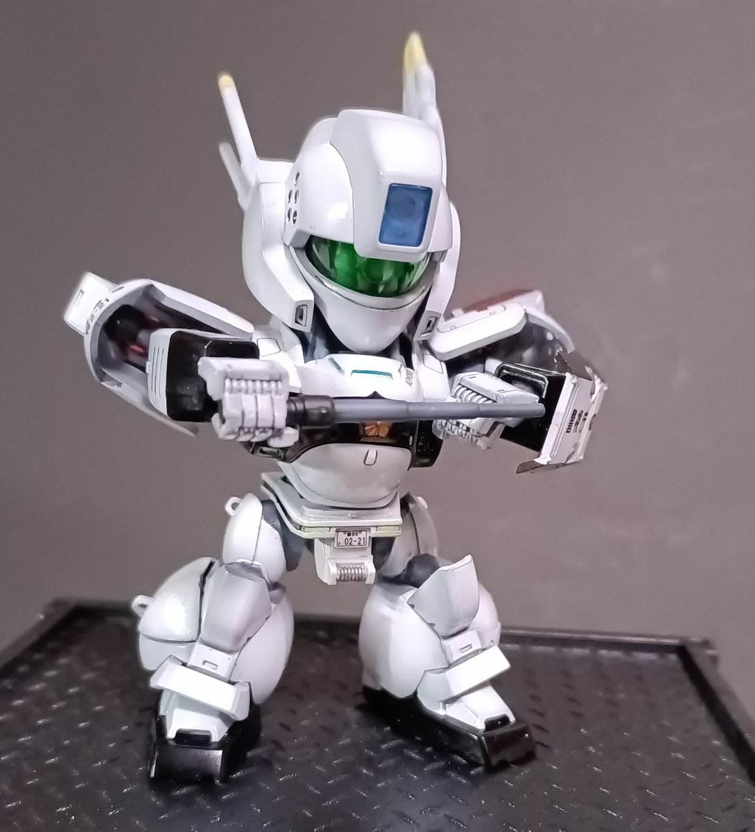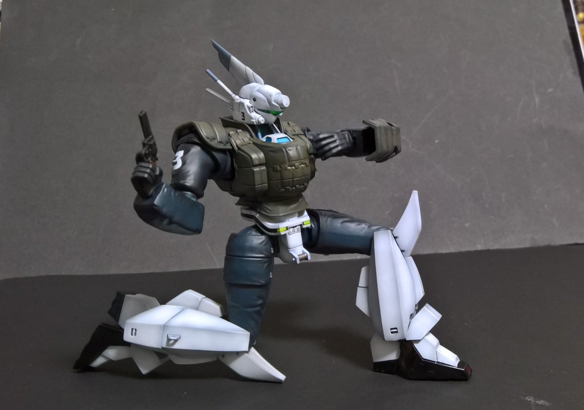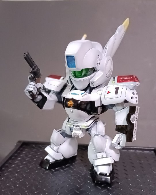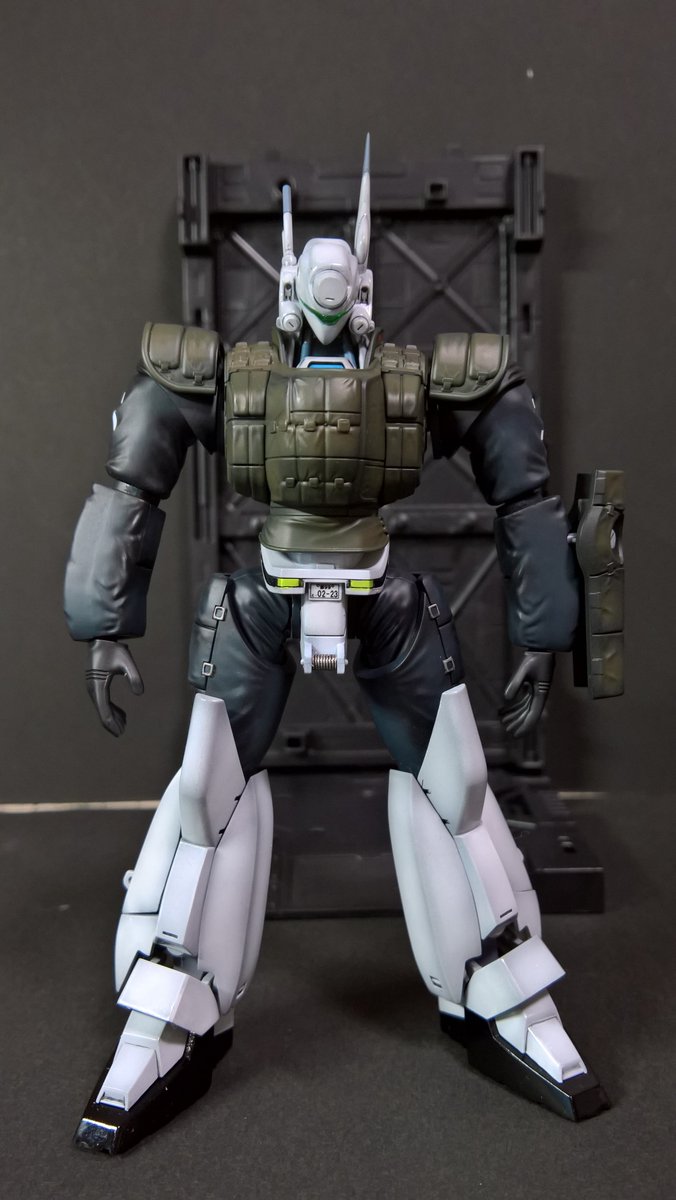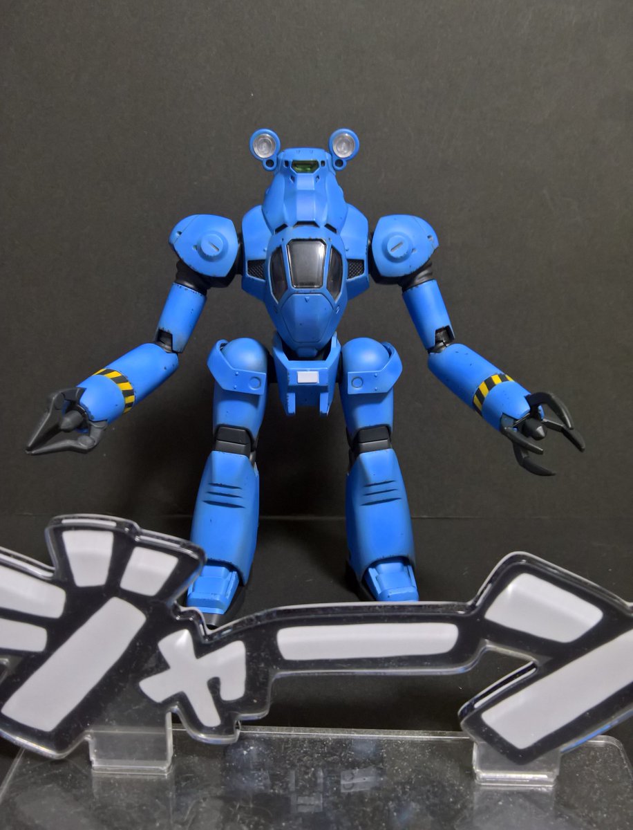 前ページの続き、青を発色させようと白立ち上げ。汚しは控え気味。塗装剥げの表現くらいにしておきました。腕のトラマーキングはシールをマスキングにて塗りました。3号機との対比🤔イングラムと比較 後までお付き合いいただきありがとうございました。 #パトレイバー模型部 # MODEROID