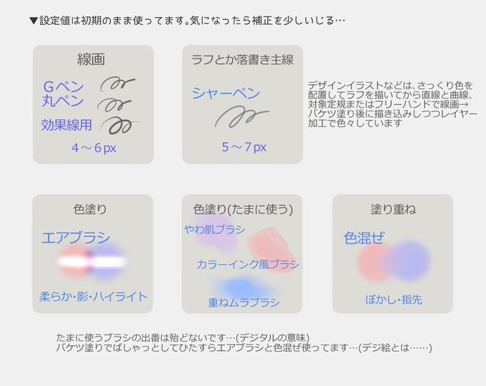 #お絵描きでよく使うペンやブラシたち クリスタpro使っています🎨 バケツ塗り(3回に1回裏切られる←ちゃんと線とじないせい)とお友達…………