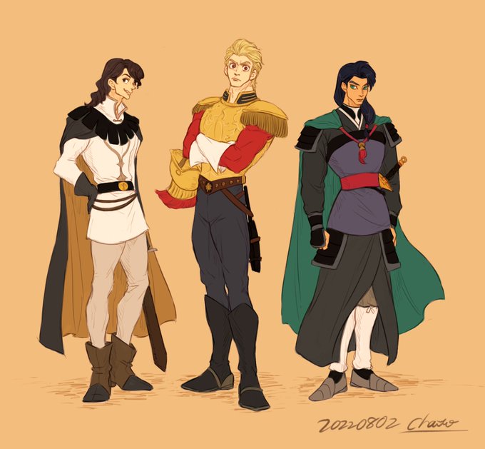 156 948 マシュマロ絵。擬人化ドナルド、ホセ、パンチート🦆🦜🐓①去年のBDのような②おめかしした感じ③レッドカーペット着想、という三人の騎士案をまとめて、改めていつもとちょっと違うスタイルで描いてみました。今までよりちょっと強めにヘアアレンジしてみたので新鮮で楽しかったです🥰 22/07/23 20:06