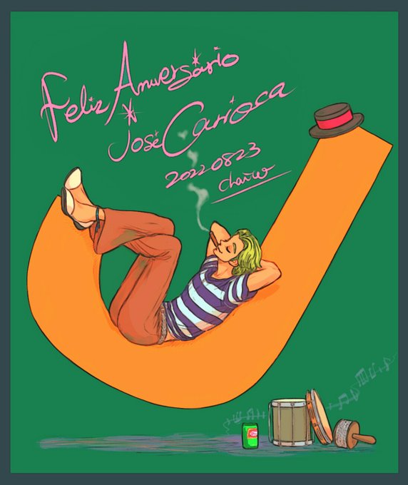 106 635 擬人化ホセ・キャリオカ🦜引き続きアルファベットモチーフ&サンバは楽しの歌詞に出てくる楽器等を添えました☺️ お誕生日おめでとう、ホセ!🎁🎉🍹🎂🚬💚 22/08/24 00:08
