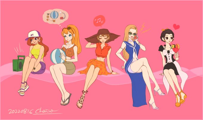 92 762 マシュマロ絵。擬人化でミニー、デイジー、クラリス、ガジェット、ロクサーヌ🥰この5人勢ぞろい案にサマーって感じのクラリスとガジェットという案をミックスして、ビーチスタイルのガールズを描かせていただきました🏖前に描いて楽しかったのでお召し物はボーイフレンドイメージにしてみてます 22/08/16 21:41