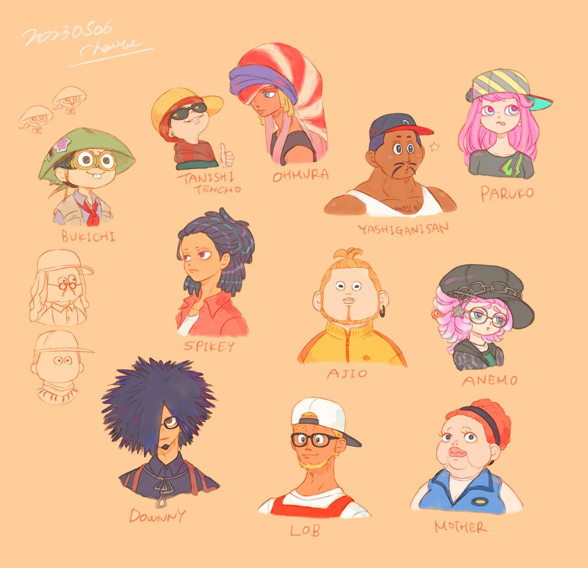 スプラトゥーン人間化・擬人化。想像できる範囲で。描く前には無理じゃないかと思ってたアジオも意外とそれっぽくなった🐡ロブお兄さんは2仕様🍤 オームラくん(推し)&タニシ店長はどんな時もポジティブな気分にさせてくれそうなので、私この世界にいたらアタマ屋に入り浸ってると思う