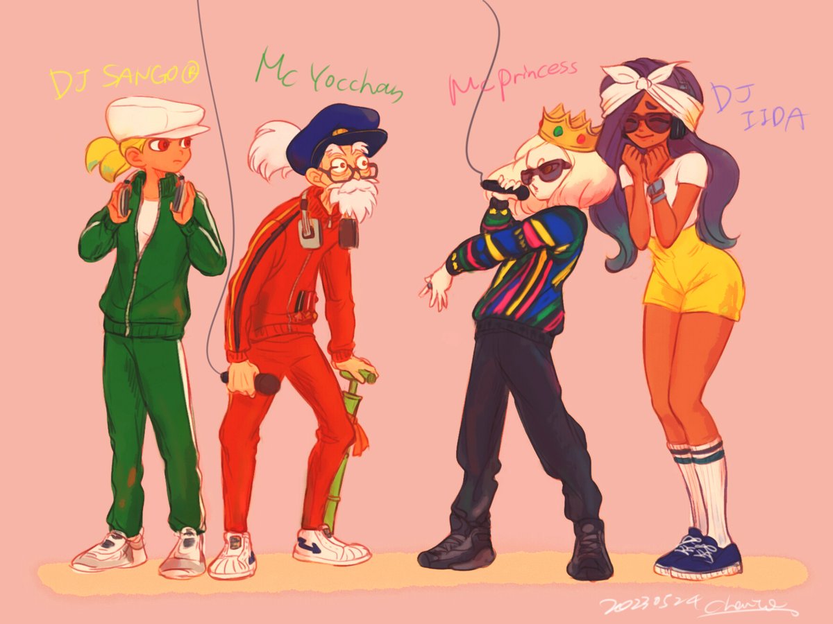 4 39 スプラトゥーン人間化・擬人化ファンアート。ハイカラウォーカーの中の4人を描いてみたかったので。ヒメちゃん、すでに3Dニットシャーク着てたんですね🦈 あとヨシオとタコワサの昔のイメージも🦑🐙 23/05/24 22:19