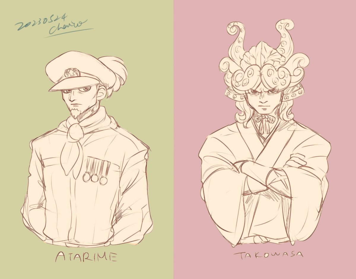 擬人化(人間化)。すりみ連合🔵⚪️🟡マンタローもフウカちゃんとウツホちゃんみたいにストリート要素&伝統衣装感のある服だと思うので、自分の中ではフーディとスニーカー+羽織りで落ち着きました。こういう擬人化変換考えるの久々で楽しい