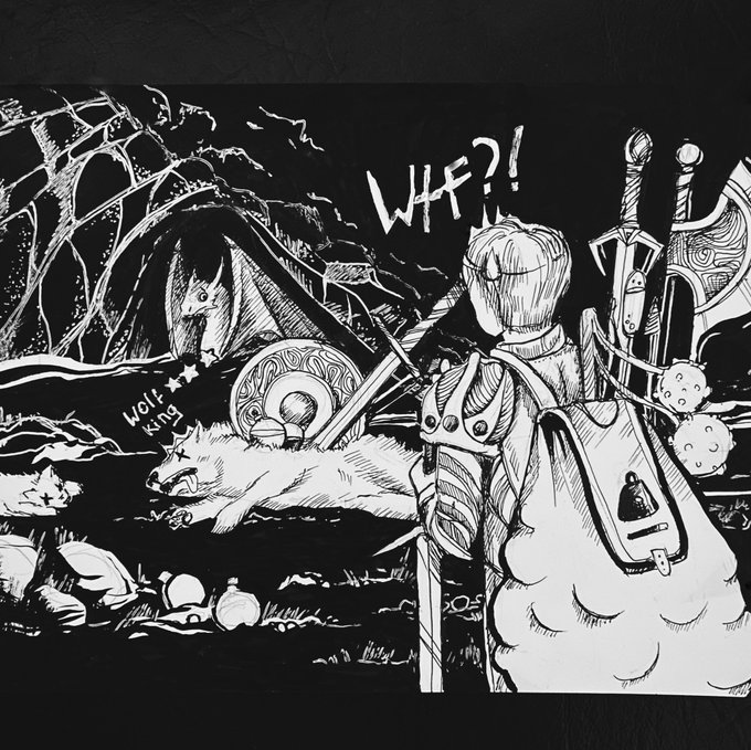 Шоу продолжается, сегодня слово #pick подбирать. Самая странная вещь в рпг — физика лута. Или как поместился в собаке щит и двуручный меч? #inktober2021