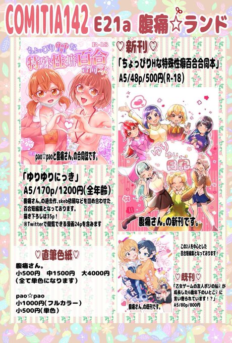 コミティア142お品書きになります❣️ ✨ 🌱 腹痛★ランド✨(西1ホール E21a) 腹痛さん(@onakaitasan2)が考えてくれたスペースのレイアウト&色紙が超絶可愛いので見てみて欲しいですッ😉✨ (※スペースには常に腹痛さんかパオのどちらかはいる予定です✨) #COMITIA142 #コミティア142 #創作百合