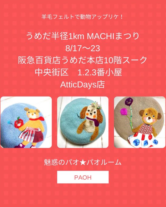次のイベントは、 『うめだ半径1km MACHIまつり』8/16〜22 阪急百貨店うめだ本店 10階スーク中央街区 AtticDays店 #belet #羊毛フェルト #贝雷帽