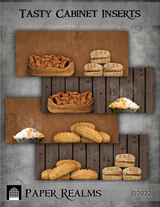 Day 27 of #inktober2022 was "snack" so I give you lovely people some new cabinet inserts with tasty treats inside! Carb-heavy snacks is kinda my thing. These are quick to assemble and will fit in your existing Tavern Cabinet props you've built, so WIN WIN on this one!