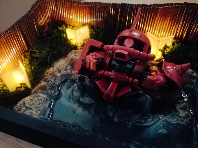 3 10 温泉のシャア専用ザク完成しました😊 飛び込んでる様にも見えますね~w 目の部分をシールではなく、クリアで作ったら可愛くなったのでパチ組で飾る用にも欲しくなりました😆 #ガンプラ #BB戦士 #筆塗り 19/12/28 15:56