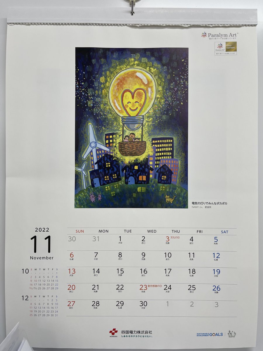 1 1 事務局のカレンダーが10月のままだったので、11月にしたついでにパシャリ 昨年四国電力さまとコンペを開催し、受賞作品でカレンダーを作成いただきました。 #パラリンアート 22/11/04 11:07