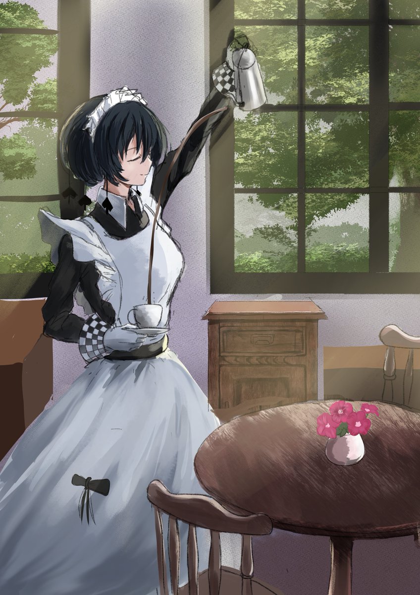 #今月描いた絵を晒そう オベロンとうちの子メイドの2枚 右はラフ 来月も再来月もガンガン描き続ける