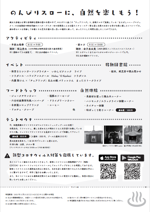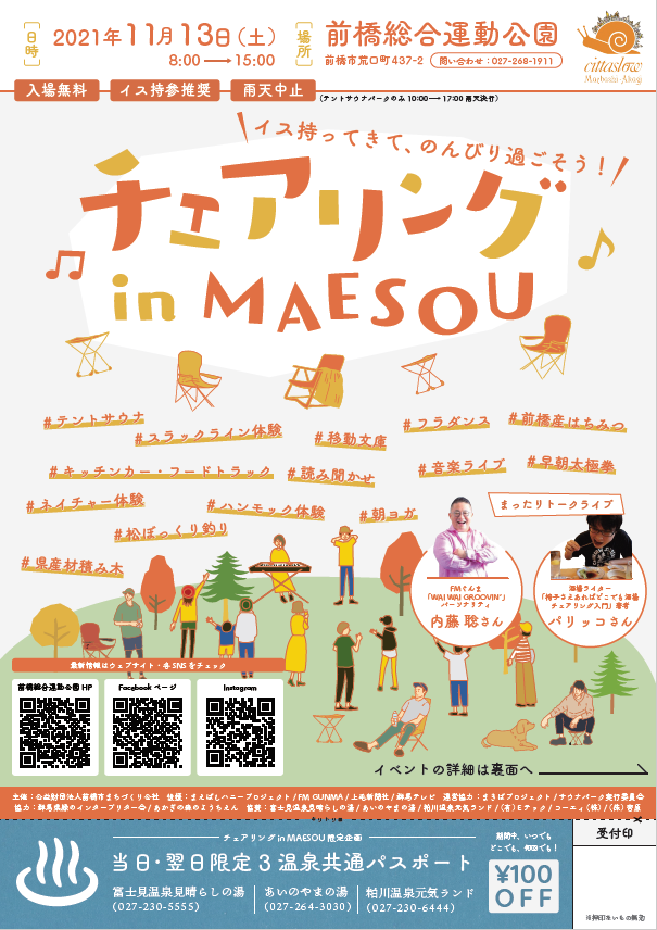 今度の土曜(11/13)、群馬県前橋市の前橋総合運動公園で、なんとチェアリングを主軸にしたイベント「チェアリング in MAESOU」が開催されます!縁あって、僕も少しトーク出演させてもらいます。天気も良さそうで楽しみ〜! city.maebashi.gunma.jp/soshiki/bunkas…