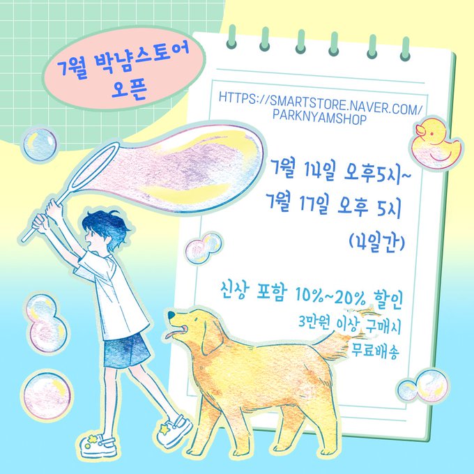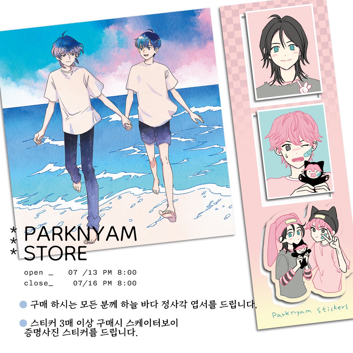 💙RT💙 7월 박냠스토어 오픈했습니다. 놀러오세요 땐스 🐳 m.smartstore.naver.com/parknyamshop 본 게시물을 알티해주시는분 두분을 뽑아 여름 신작 스티커와 키링을 보내드려요! 발표는 일요일 오전에 할게요.