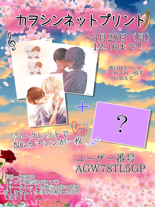 カヲシンネップリ登録しました〜✨ 庵貞Qカヲシンの過去絵+シークレット新規絵NGカヲシンです♡ ローソンとファミマで印刷できます! ユーザー番号 AGW78TL5GP 3月28日 12:16まで ネップリ報告喜びます!お手隙の際にでもどうぞ〜!