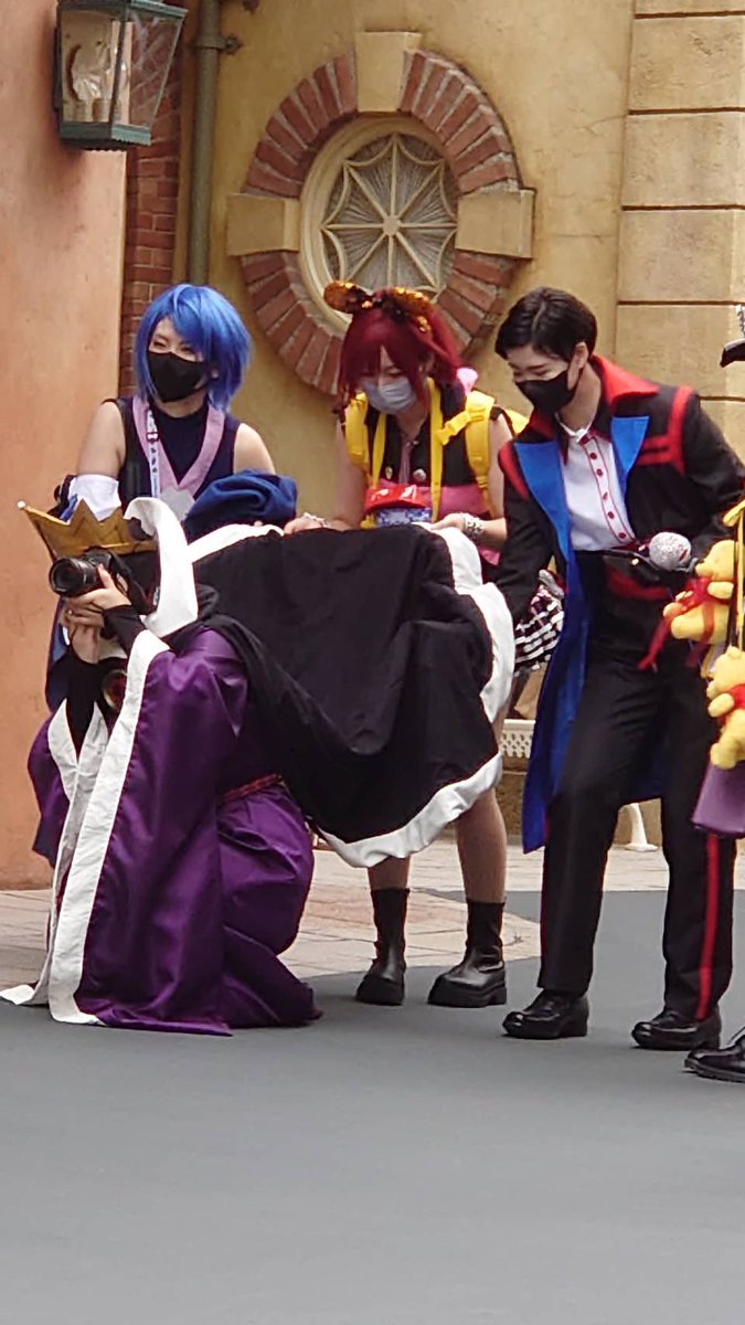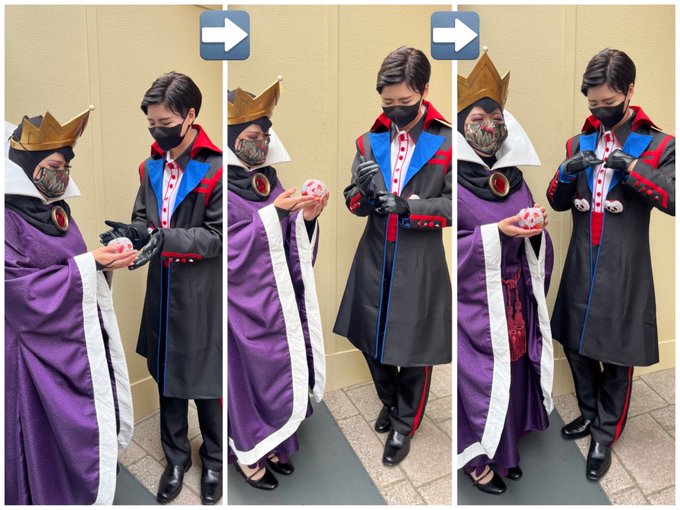 -Snow White- アップルポイズン🍎蓮さん 女王👑アル子 📸GUMIさん(🐙アースラ) りんごを受け取ってご満悦の女王✨ いや、そんな事より、アップルポイズンの衣装の整える方を見てくれ‼︎‼︎‼︎ #Dハロ仮装 #Dハロ仮装2022