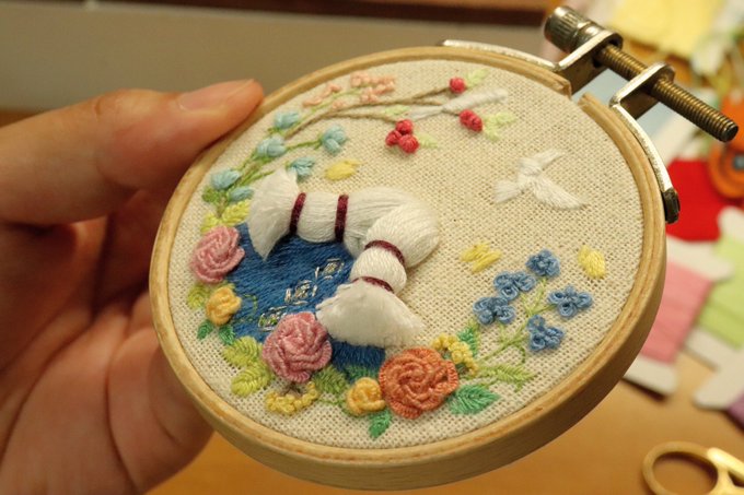 草原で遊び疲れておねむなスズメくん刺繍完成〜!!! とてつもなく可愛いものが出来てしまった…花火杖埋まってるけど… この後ブローチにします! #sky星を紡ぐ子どもたち #thatskygame #sky手芸部