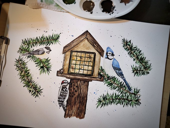 #ArtAdventCalendar Day 3: a cute little painting I did of winter birds at a birdfeeder. #artistsontwitter #artist