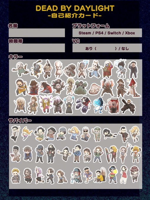 今夜開始の新チャプター対応の自己紹介カードです! 個人の範囲でしたらご自由にご利用ください🤗 来週からの6周年と併せてみんなで楽しくDBDしましょう!✨ #dbd #dbd自己紹介カード