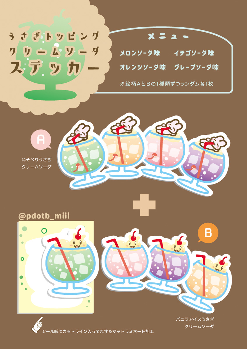 うさぎ🐰トッピング付クリームソーダステッカーは、 絵柄1種類ずつの2枚セットでソーダ味がランダムです。 分かりづらい表記ですがこちらも併せてよろしくお願いします。 RT share plz! #C101 #creamsoda