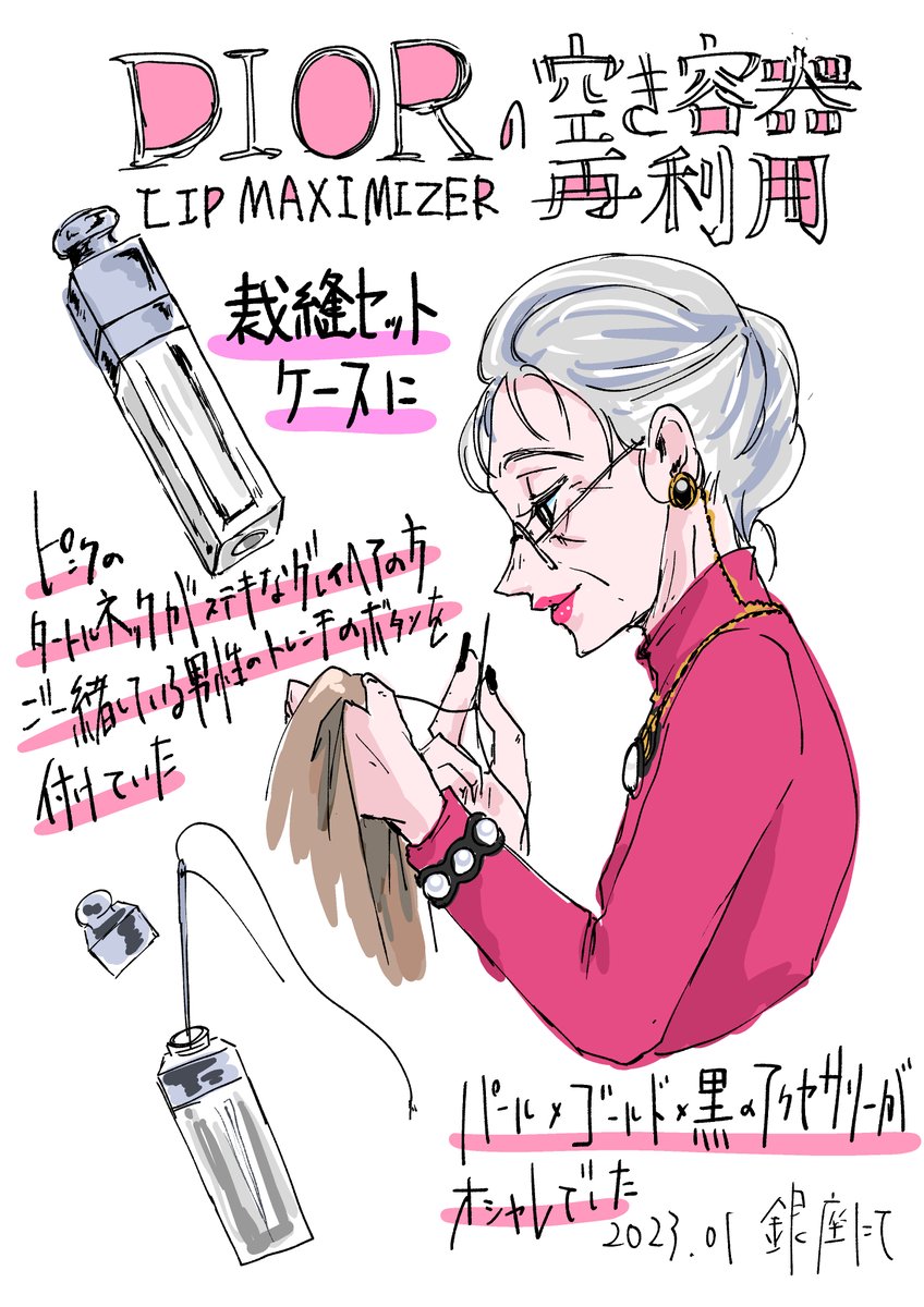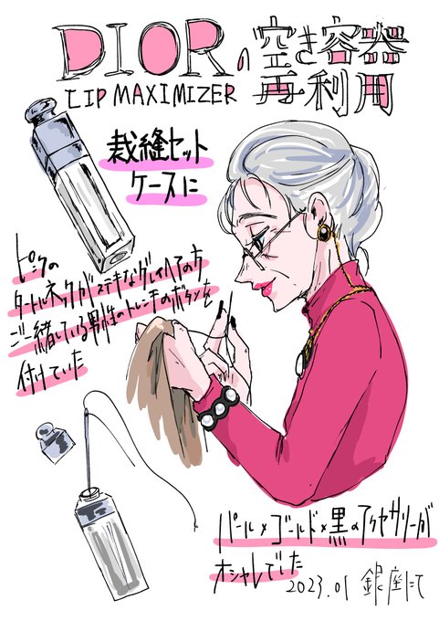 44 239 銀座で見かけた素敵なマダムがDiorのリップマキシマイザーの容器を裁縫セットケース(針入れ?)にしていたのが素敵だった、という日記です、 23/01/29 13:54