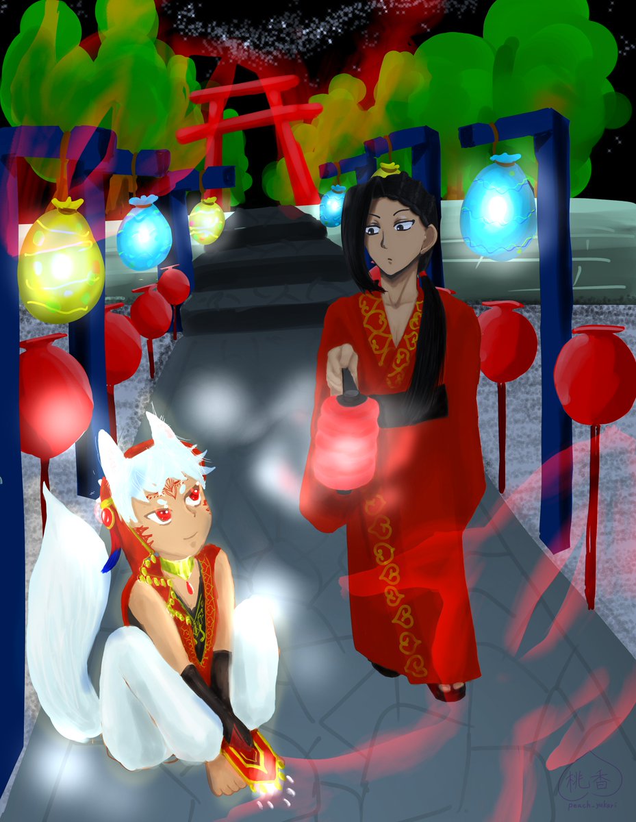 #twst_残暑見舞い 朝夕は涼しくなって来ましたが、昼間はまだまだ暑いですね😵 本企画にスカラビアで参加させていただきました! スケアリー衣装を浴衣にしてみました!お祭りです🎆 他の参加者様の作品も是非✨ #twstファンアート #ツイステファンアート #ジャミル・バイパー #カリム・アルアジーム