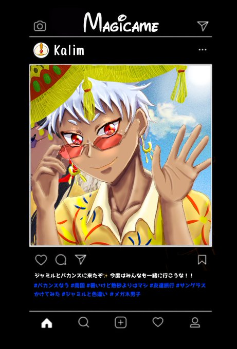 #twst_メガネ男子企画 #twstファンアート #ツイステファンアート 素敵な企画に参加させて頂きました! メガネ男子と聞いて真っ先にカリムを思い浮かべたので描けて嬉しいです😆✨ 2枚目はおまけです。モブ女垢です。苦手な人は1枚目だけ見て下さい😌 お借りしました↓ #みんなのマジカメが見たい