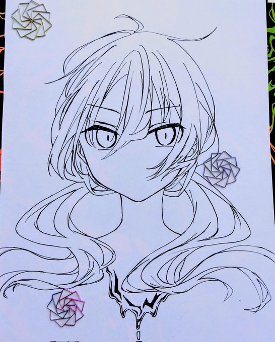 ちょい前に描いたヤツ 髪の感じ結構お気に入り⸜(* ॑꒳ˆ * )⋆* ちなみにこの花みたいなヤツはホッチキスの針よ( σ˙꒳˙)σツンツン #イラスト #イラスト好きな人と繋がりたい #イラスト練習中 #絵描きさんとつながりたい