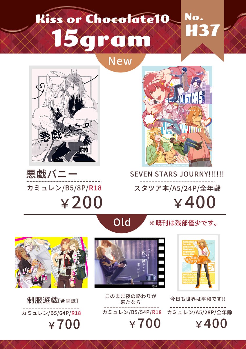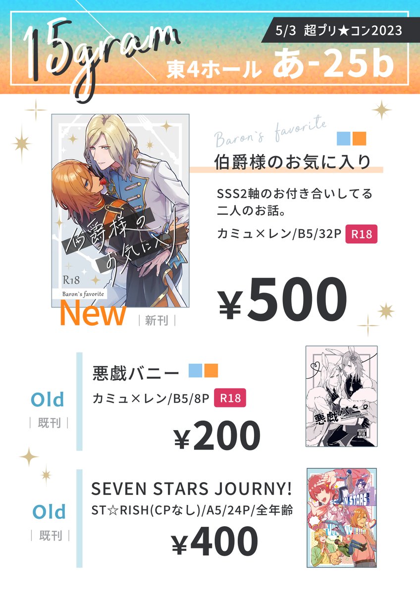 【東4ホール/あ25b】15gramのプリコンお品書きです!新刊はカミュレンです。開始直後はお買い物ツアーズでいないので、お目当てのお宝をゲットしてからゆっくりお越しくださいませ! 各種頒布物の通販リンクはこちらのキャプションから飛べます↓ pixiv.net/artworks/10767…
