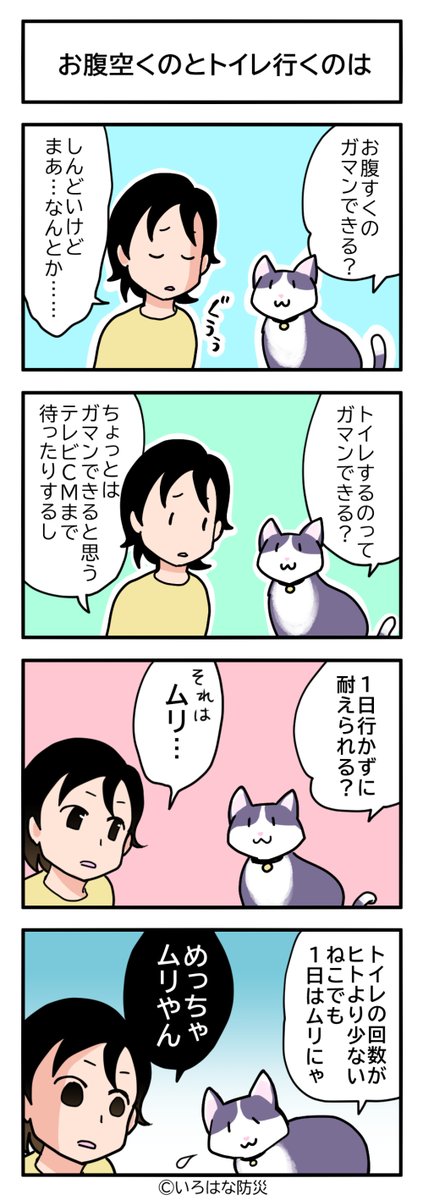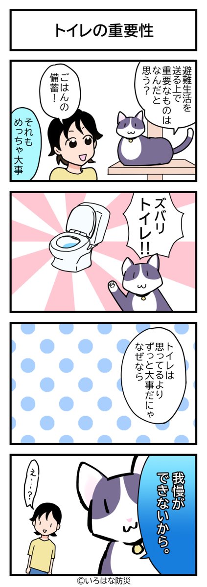 防災4コマトイレ編 「お腹空くのとトイレ行くのは」 どっちも無理だけどどちらかというと。 irohana-bosai.com/manga/manga003… #4コマ漫画 #防災まんが #漫画が読めるハッシュタグ #いろはな防災