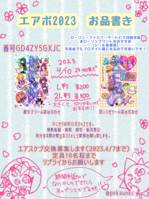 20 27 エアボ'23(@airbopetit ) 🌸お品書きです!🌸 実物の写真イメージもあります🥺 可愛いシールに仕上がりました💓 お値段は少ししますが、2L版のがシールとして✂️で切りやすくておすすめです✨ エアスケブ交換も随時お待ちしてます🤗 23/04/02 23:47