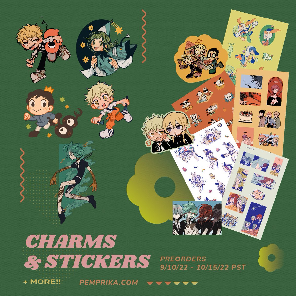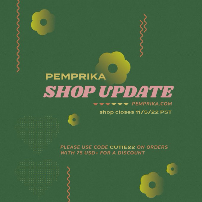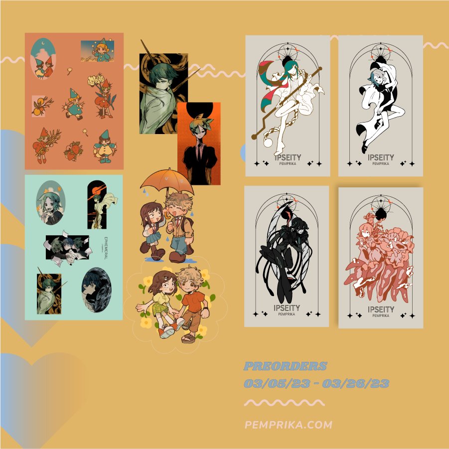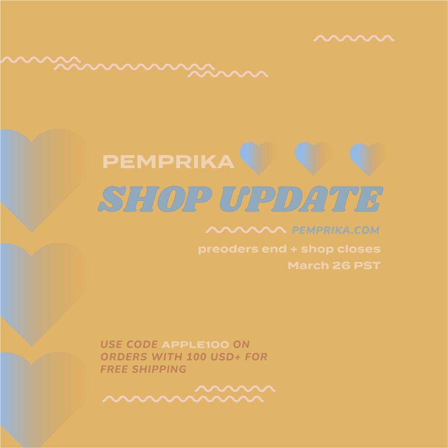 shop update!! 🫨 some preorders, restocks, and new adds, including pins, stickers, charms, prints, and notebooks 🕺 shop is open from june 25 to july 23 PST! 🥳📣 🍎pemprika.com🍎