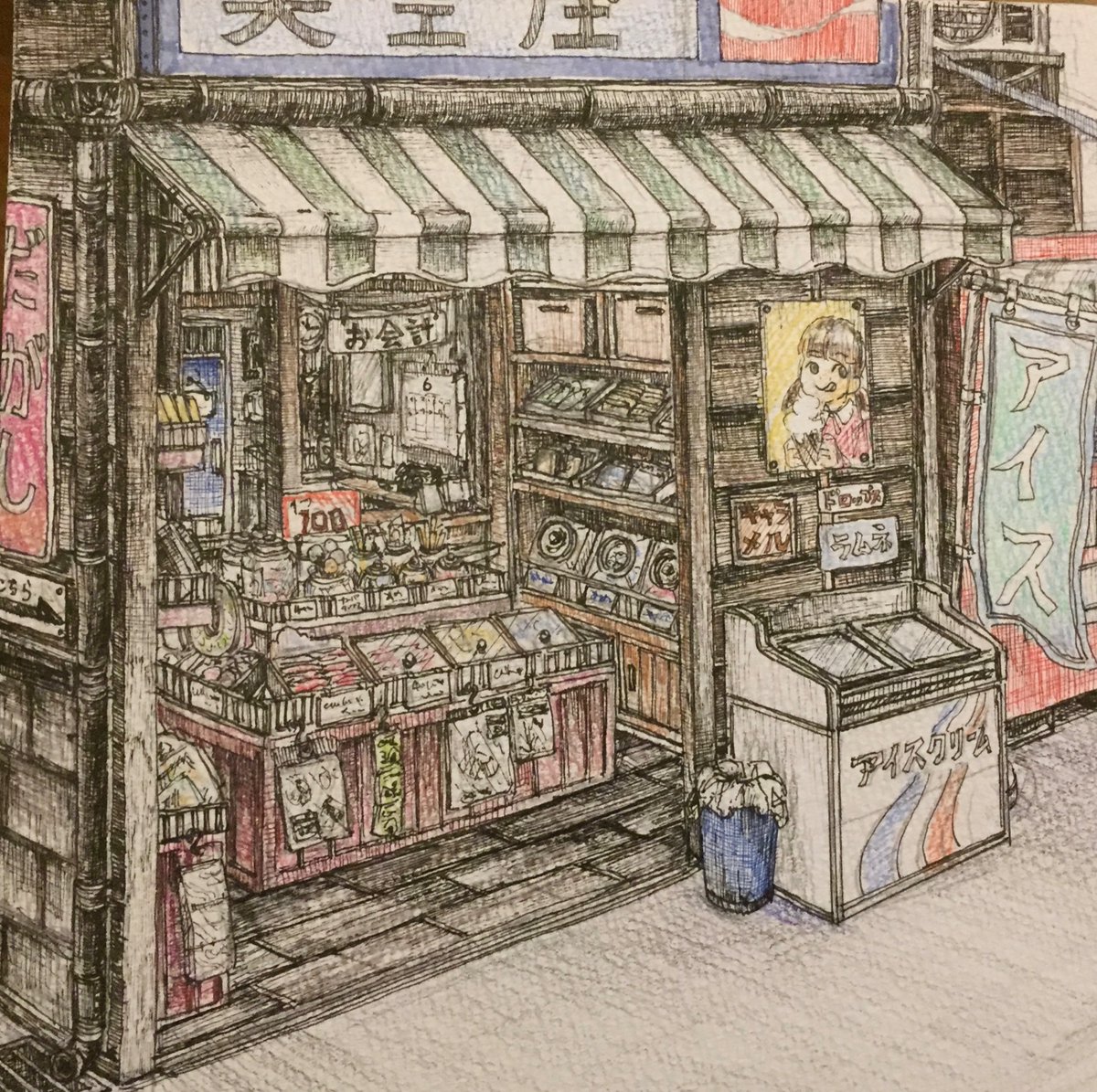 駄菓子屋さん完成! #ペン画 #絵描きさんと繋がりたい #絵柄が好みって人にフォローされたい