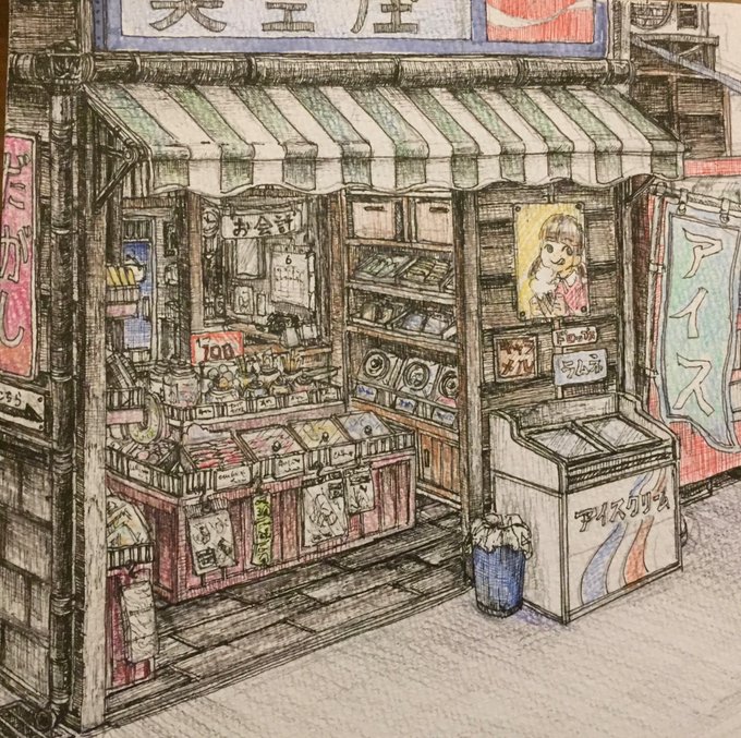 駄菓子屋さん、早めに完成させたい #ペン画 #絵描きさんと繋がりたい #絵柄が好みっていう人にフォローされたい