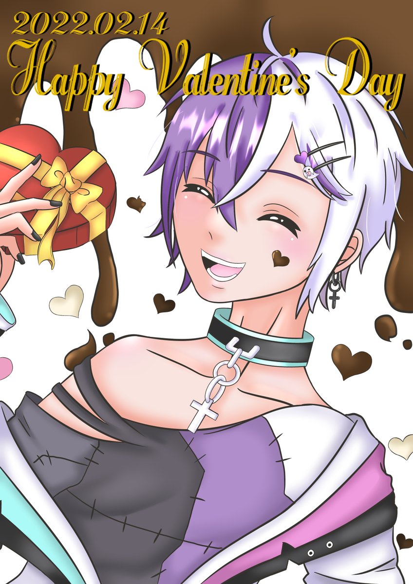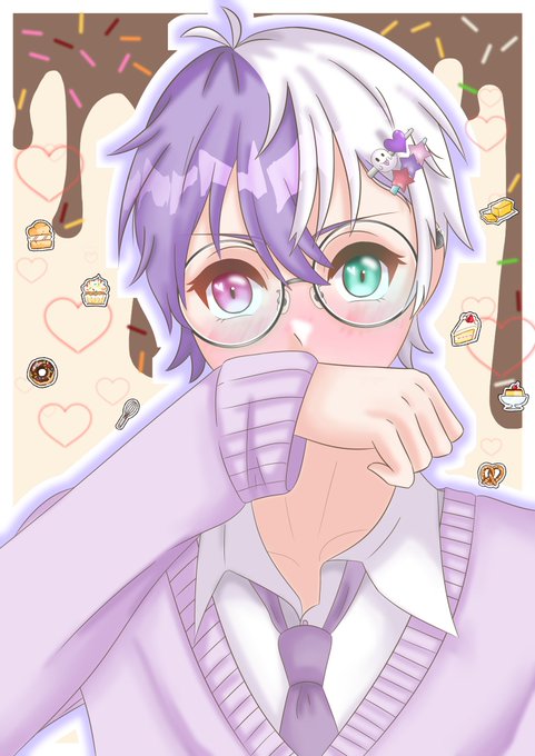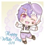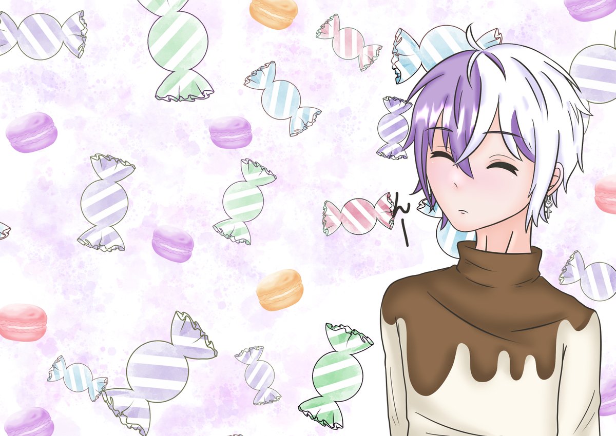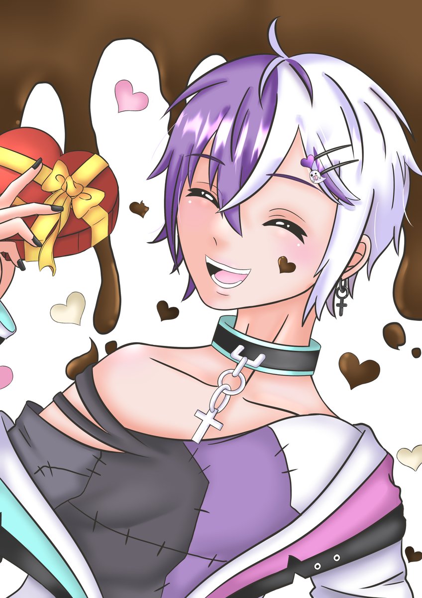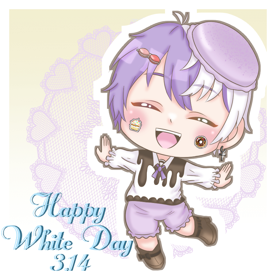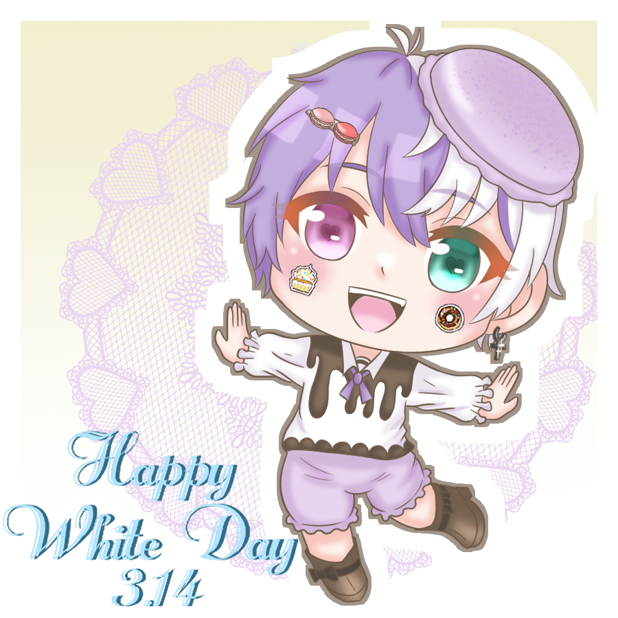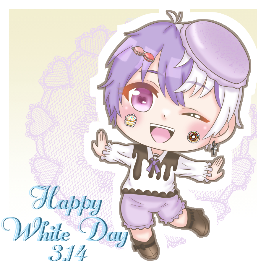 Happy White Day! 👻💜「バレンタインのお返しだよ!んー…」 ※服装は適当に考えました。 2枚目:文字なし 3枚目:背景透過(なってると思う) #初瀬におまかせ