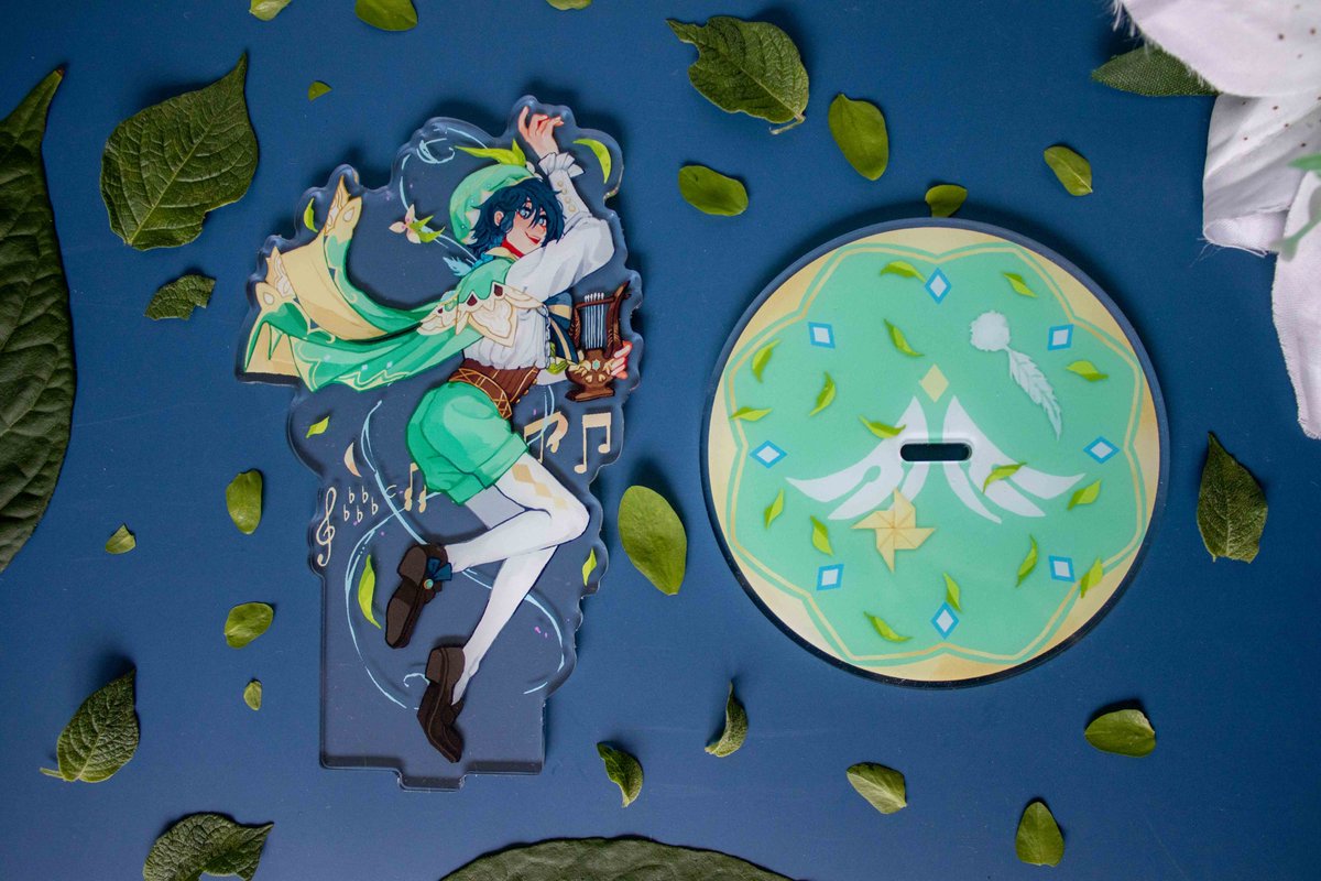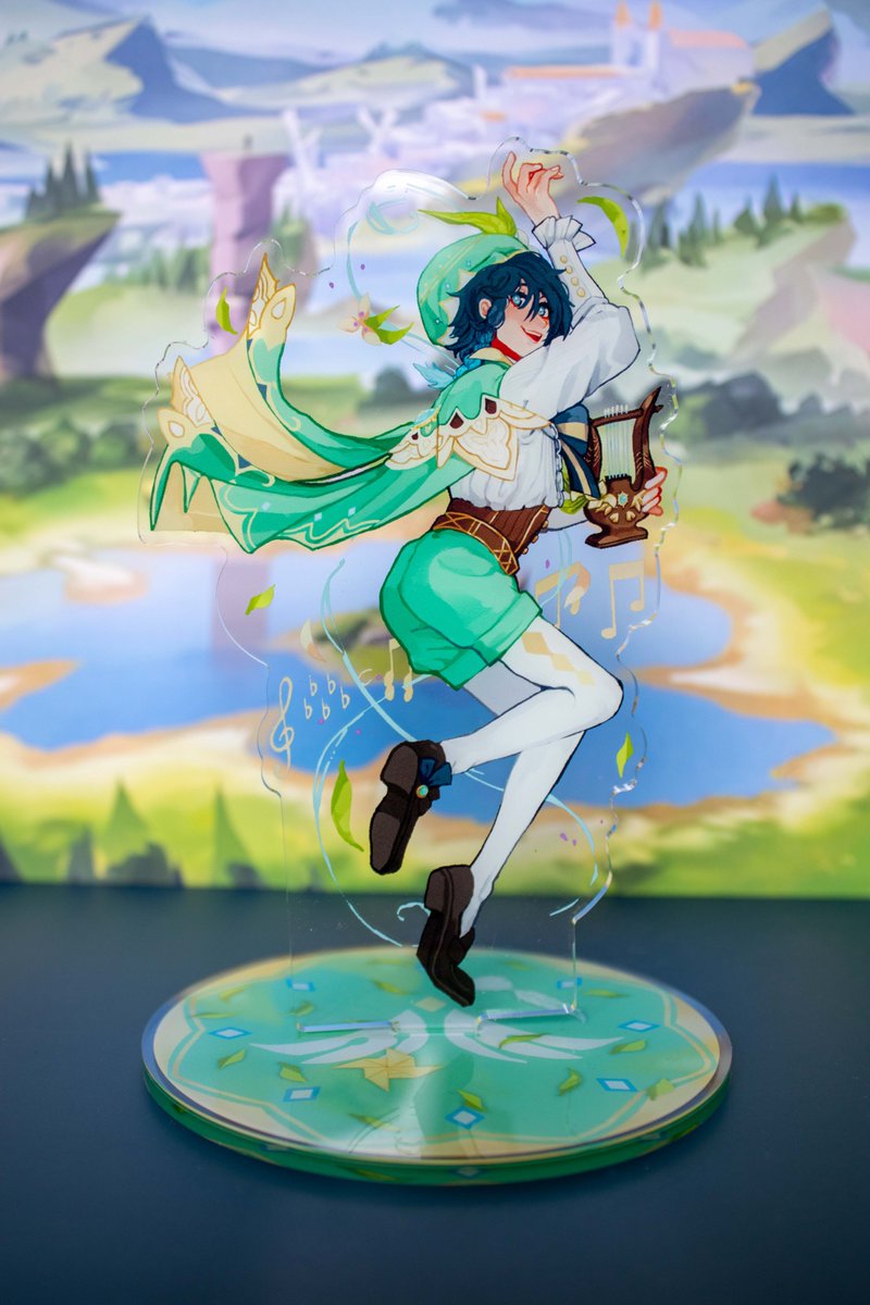 Photographs of the Venti acrylic standee! Now available to order on the store! I'm so proud of how these standees came out!🥺 Available at penguinsbite.com/store #genshinimpact #genshinventi #venti #genshinimpactfanart #genimpventi #ventifanart