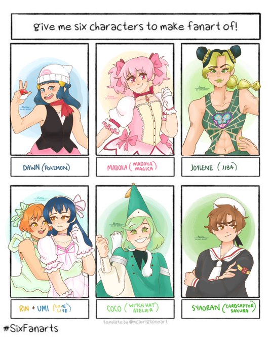 time again for another #SixFanarts spread!! thank you to everyone who left suggestions, this was a fun range ✏️ [#pokemon #madokamagica #jojosbizarreadventure #lovelive #witchhatatelier #cardcaptorsakura]