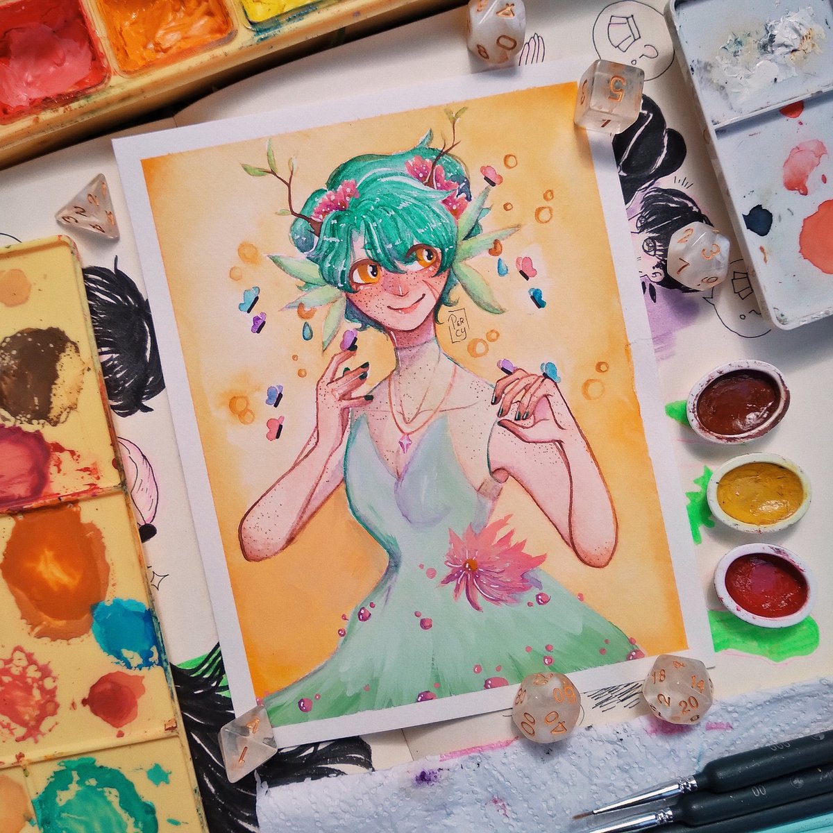 [ 🌺🌲🌷 🦋 ] - - This was a small experiment using my gouache paint set! Its just Leafy in a dress honestly hehe - - #ArtistsofSEA #ArtistOnInstagram #commissionsopen #ArtistOnInstagram #dnd #dndoc #dnd5e #dungeonsanddragons